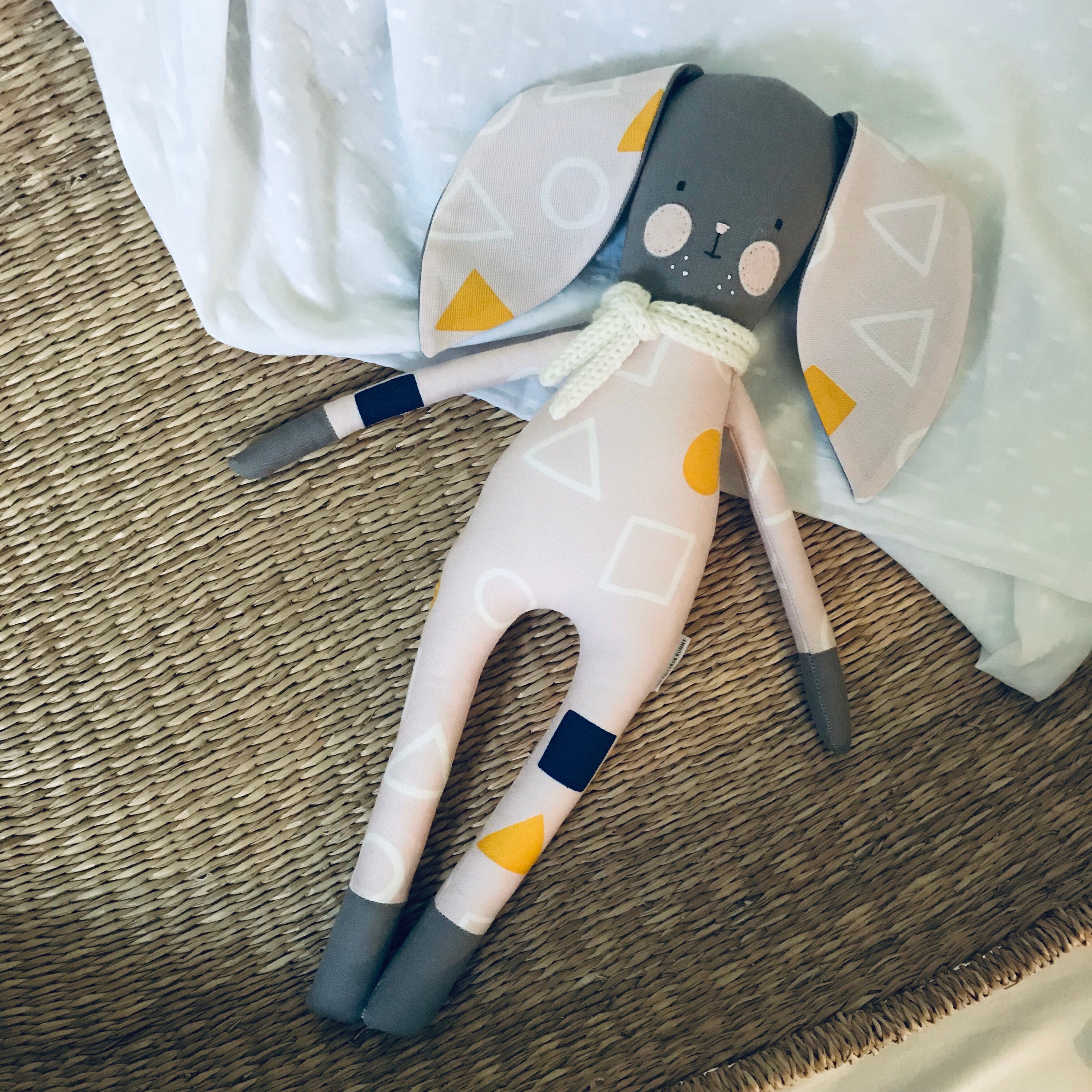 This is the original TillyBob Bunny design. The soft bodied bunny makes a perfect friend for your little one and is easy for small hands to grasp. The bunnies also make a perfect accessory for a new nursery and wonderful keepsake. Each bunny is completely handmade by Holly and unique. This fun geometric design has shapes on a lovely pale pink cotton/linen canvas, the bunny also has a cosy wool scarf too! You will be purchasing the TillyBob bunny pictured here. Please note there may be slight colour differences due to lighting and screen resolution.